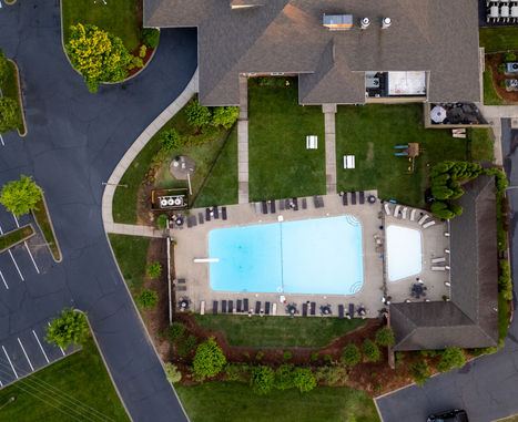 Surrounding the pool area, members will find a plethora of picnic tables, lounge chairs, and dining tables with umbrellas for convenient dining. The lawn area is perfect for pool parties and features a swing set for littles, corn hole boards, and more.